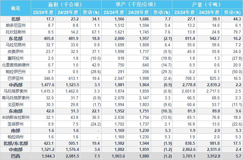 2024/25年度巴西棉花種植面積預(yù)估為208.36萬公頃,同比增加7.2%,2023/24年度為194.43萬公頃。