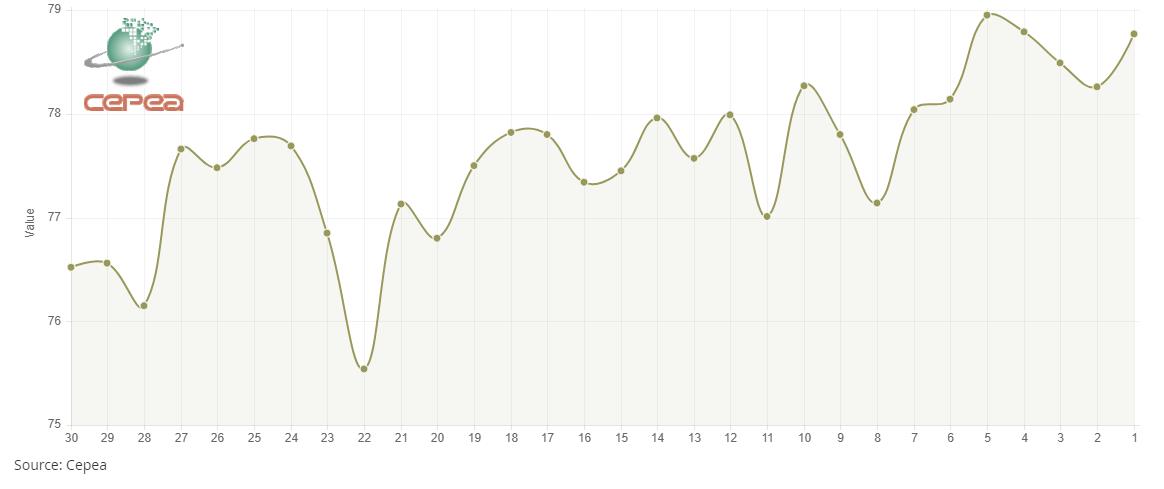 6月13日(周五),巴西CEPEA/ESALQ棉花價(jià)格指數(shù)報(bào)78.77美分/磅,較前一交易日上漲0.65%,較上月同期上漲2.29%。