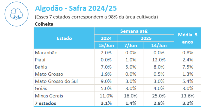 據(jù)巴西農(nóng)業(yè)部下屬的國家商品供應(yīng)公司CONAB,截至6月14日,巴西棉花收割率為2.8%,上周為1.4%,去年同期為3.1%,五年均值為3.2%。