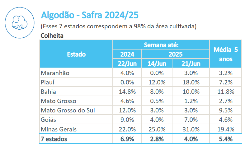 據(jù)巴西農(nóng)業(yè)部下屬的國家商品供應(yīng)公司CONAB,截至6月21日,巴西棉花收割率為4.0%,上周為2.8%,去年同期為6.9%,五年均值為5.4%。
