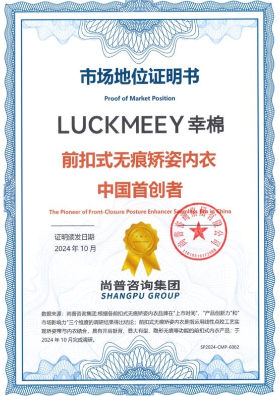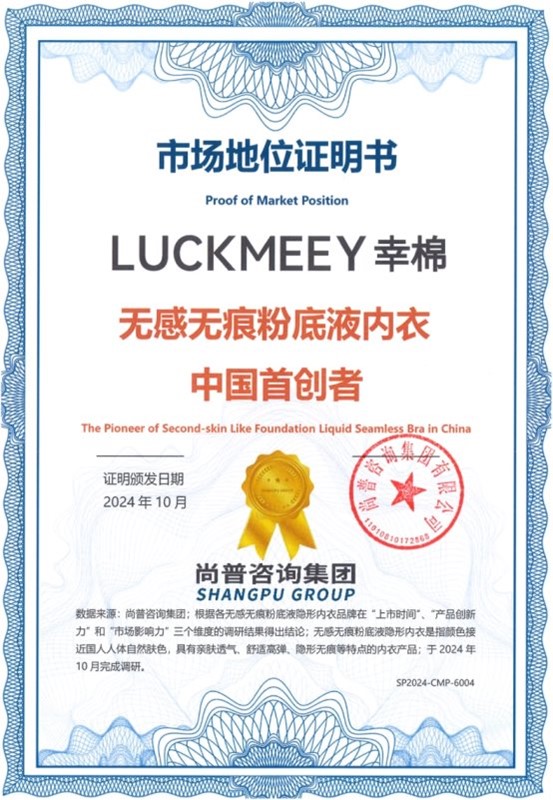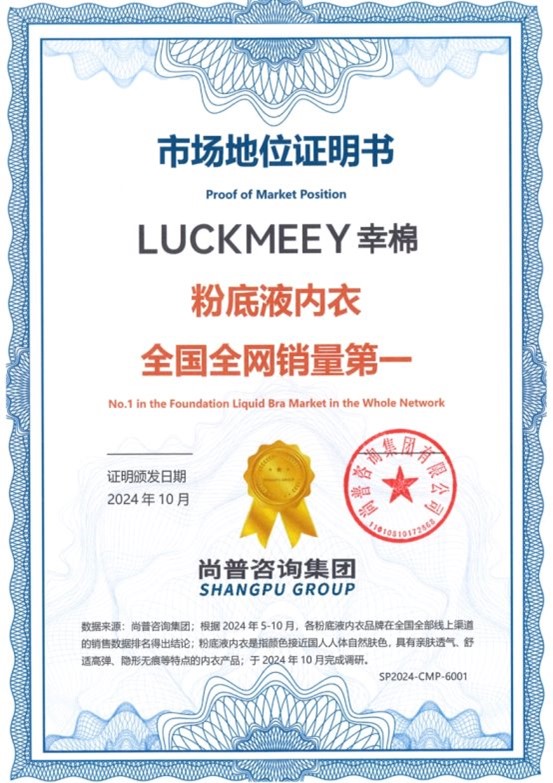 2024年10月,廣州幸棉網(wǎng)絡科技有限公司(以下簡稱“幸棉”)榮獲尚普咨詢集團【幸棉,粉底液內衣全國全網(wǎng)銷量第一】【幸棉,前扣式無痕矯姿內衣中國首創(chuàng)者】【幸棉,無感無痕粉底液內衣中國首創(chuàng)者】市場地位證書,標志著幸棉在我國內衣行業(yè)中的卓越地位及市場的高度認可。