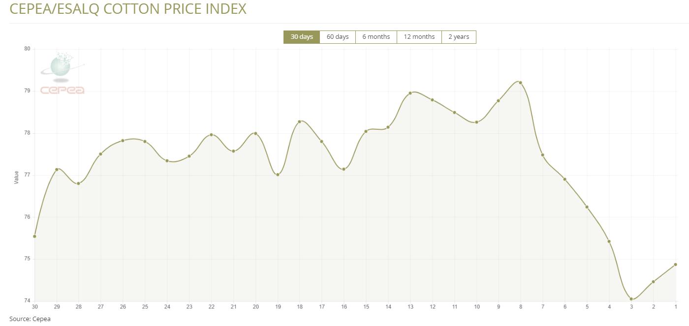 6月26日(周四),巴西CEPEA/ESALQ棉花價格指數(shù)報74.87美分/磅,較前一交易日上漲0.55%,較上月同期下跌2.78%。