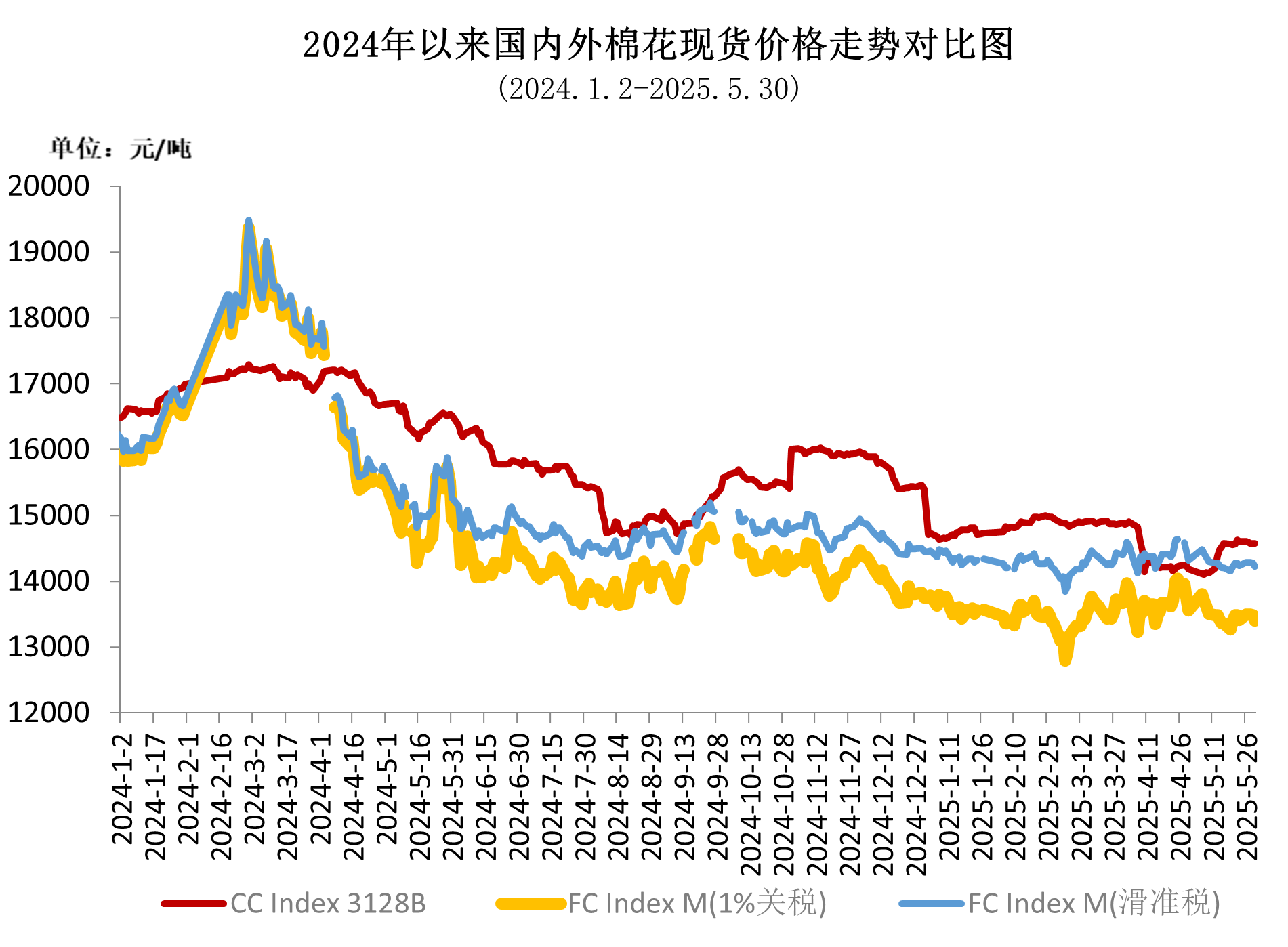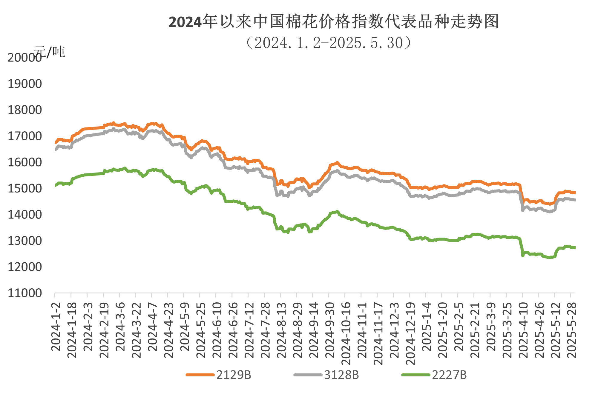 5月上旬,在美國關(guān)稅政策的不確定性影響下,中國棉花價格指數(shù)維持震蕩走勢;中下旬,國內(nèi)出臺降息降準政策、中美就經(jīng)貿(mào)問題進行會談并發(fā)布聯(lián)合聲明,釋放積極信號,市場信心得到顯著提升,中國棉花價格指數(shù)最高漲至14621元/噸;月末市場利好逐漸消化,加上紡織行業(yè)進入傳統(tǒng)淡季,訂單未有明顯好轉(zhuǎn),中國棉花價格指數(shù)小幅回落。5月中國棉花價格指數(shù)(CCIndex3128B)月均價14445元/噸,環(huán)比上漲78元,同比下跌1997元。