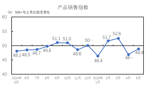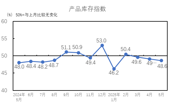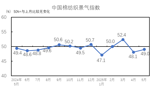 2025年5月,產(chǎn)品庫存指數(shù)為48.6%,低于臨界點,較4月下降0.5個百分點,產(chǎn)品的庫存量上升。5月,市場淡季行情持續(xù),企業(yè)訂單和產(chǎn)品銷售維持弱勢,成品庫存量上升。紗庫存量指數(shù)為48.8%,較4月下降0.8個百分點;布庫存量指數(shù)為48.3%,較4月下降0.2個百分點。紗庫存量指數(shù)和布庫存量指數(shù)均低于臨界點。