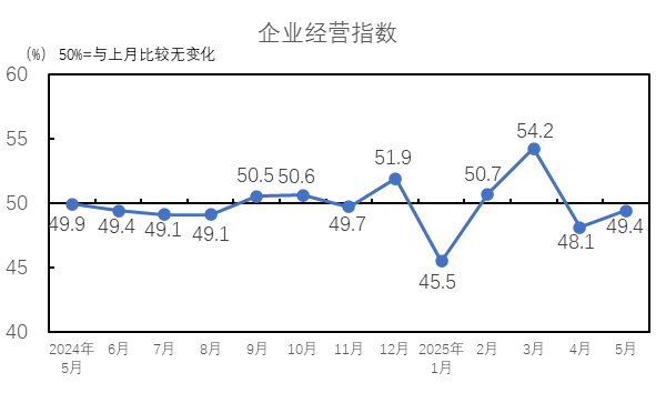 2025年5月,企業(yè)經(jīng)營指數(shù)為49.4%,低于臨界點,較4月上升1.3個百分點。5月受《中美日內(nèi)瓦經(jīng)貿(mào)會談聯(lián)合聲明》提振,宏觀市場情緒好轉(zhuǎn),棉花、棉紗價格上升,企業(yè)利潤總額較4月好轉(zhuǎn),企業(yè)經(jīng)營指數(shù)出現(xiàn)回升。從構(gòu)成企業(yè)經(jīng)營指數(shù)的分項指標(biāo)看,營業(yè)收入指數(shù)為47.9%,較4月上升0.2個百分點;利潤總額指數(shù)為50.9%,較4月上升2.3個百分點。