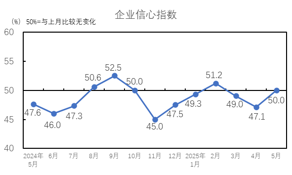 2025年5月,企業(yè)信心指數(shù)為50.0%,較4月上升2.9個百分點,企業(yè)信心指數(shù)處臨界點,對未來市場的信心較上月好轉(zhuǎn)。5月《中美日內(nèi)瓦經(jīng)貿(mào)會談聯(lián)合聲明》發(fā)布,美國加征的關(guān)稅進行重大調(diào)整,市場情緒回升,但下游需求及訂單并未出現(xiàn)明顯增量,企業(yè)信心恢復(fù)程度有限,對未來市場多持謹慎態(tài)度。