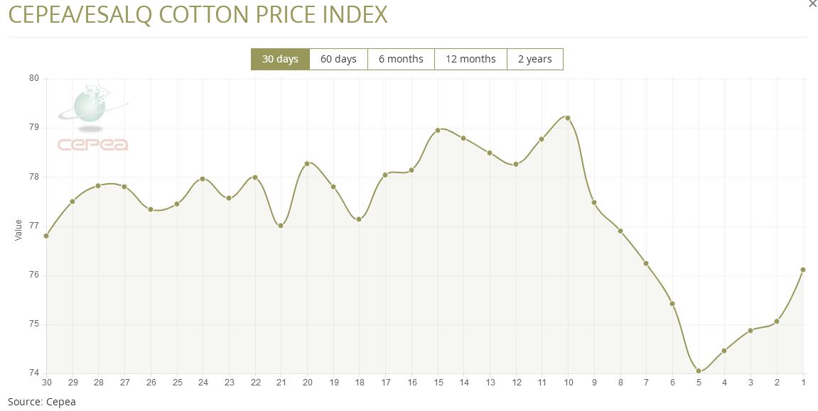 6月30日(周一),巴西CEPEA/ESALQ棉花價格指數(shù)報76.11美分/磅,較前一交易日上漲1.4%,較上月同期下跌1.17%。