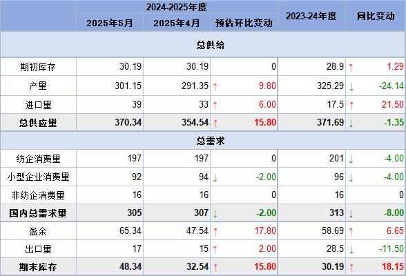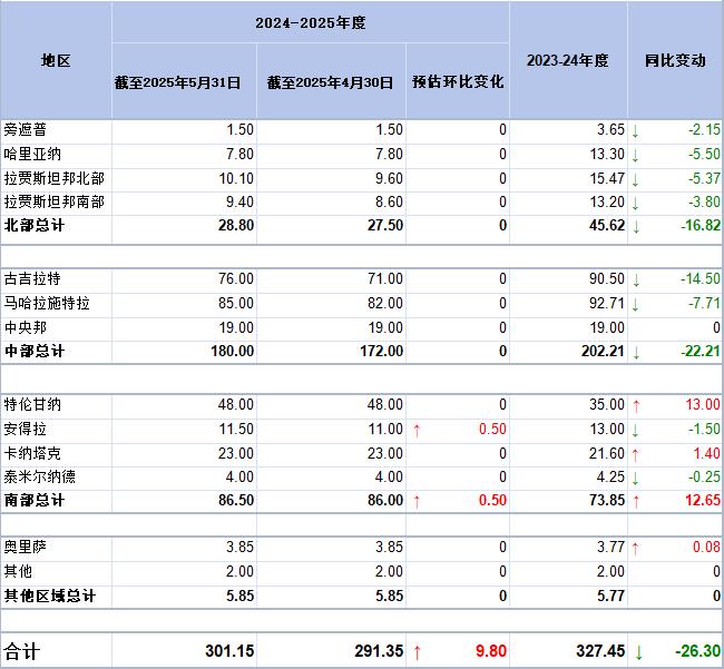 印度棉花協(xié)會(CAI)發(fā)布的報告顯示,當(dāng)前2024/25年度(10月-次年9月)棉花產(chǎn)量預(yù)估進一步提升至3011.5萬包(170公斤/包)。在4月報告中,該協(xié)會預(yù)計產(chǎn)量為2913.5萬包。去年印度棉花產(chǎn)量為3274.5萬包。