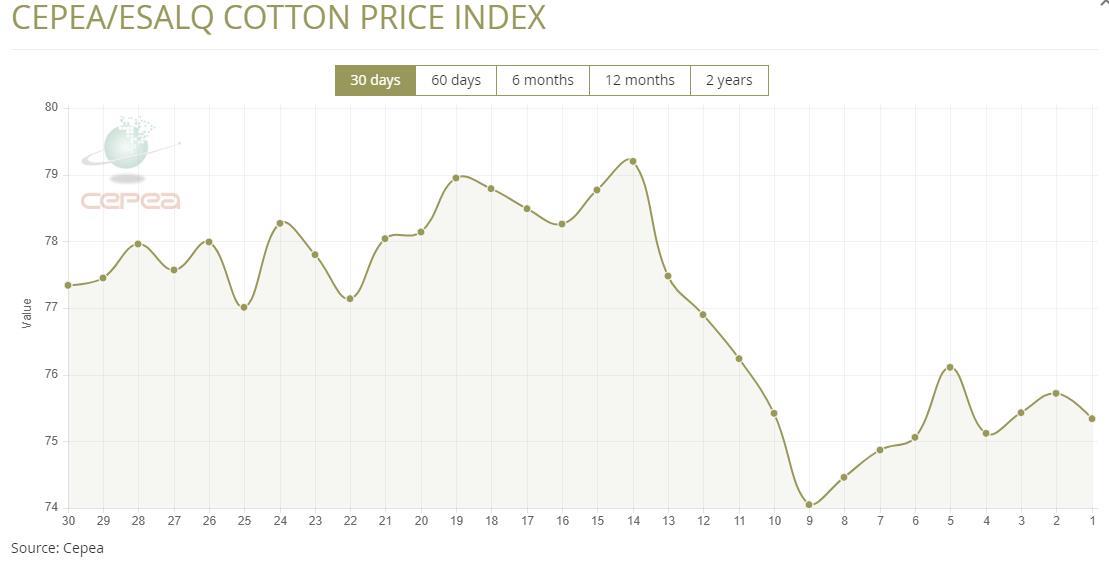 7月4日(周五),巴西CEPEA/ESALQ棉花價(jià)格指數(shù)報(bào)75.34美分/磅,較前一交易日下滑0.50%,較上月同期下跌1.01%。