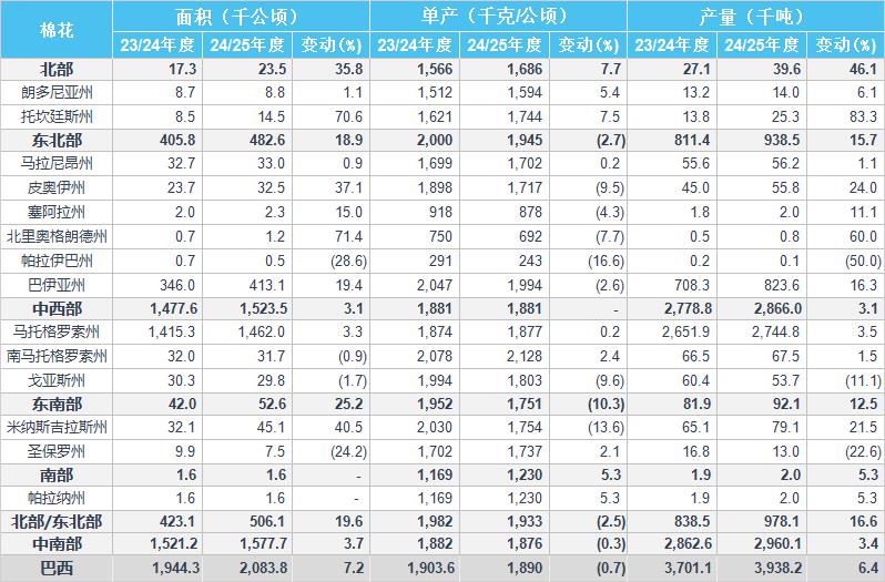 2024/25年度巴西棉花種植面積預(yù)估為208.38萬公頃,同比增加7.2%,2023/24年度為194.43萬公頃。