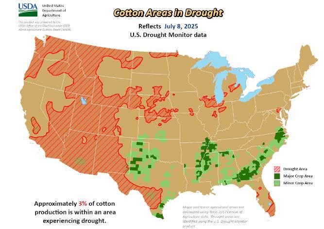 美國農(nóng)業(yè)部(USDA)下屬的首席經(jīng)濟(jì)學(xué)家辦公室(OCE)當(dāng)?shù)貢r間周四根據(jù)當(dāng)日發(fā)布的美國旱情監(jiān)測圖整理的美國農(nóng)業(yè)旱情文件顯示,截至7月8日當(dāng)周,約3%美棉產(chǎn)區(qū)受到干旱影響,仍持平于前一周。