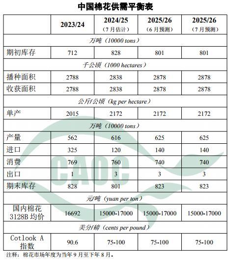 本月對中國棉花供需形勢預測與上月保持一致。6月末,全國大部分產區(qū)棉花處現蕾至開花期,發(fā)育期較常年提前4-7天。中國氣象局氣候預測,7月新疆氣溫持續(xù)偏高,高溫日數較常年同期偏多,棉花遭受高溫熱害風險較高。當前棉花庫存總量持續(xù)下降,但下游市場淡季特征明顯,紡企原料采購謹慎,需持續(xù)關注天氣擾動和關稅不確定性的影響。