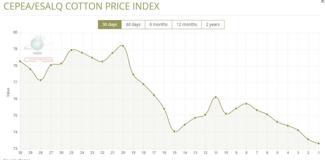 7月14日(周一),巴西CEPEA/ESALQ棉花價格指數(shù)報73.33美分/磅,較前一交易日下滑0.34%,較上月同期下跌3.65%。