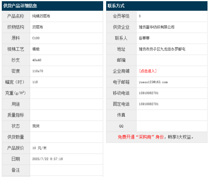 7月22日,濰坊富華紡織有限公司純棉雙層布JC100 40x40 110x70 118",報價為10元/米,實際成交價以協(xié)商為準。[點擊查看詳情]