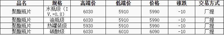 華東聚酯瓶片價(jià)格下調(diào)10元至5990元/噸,宏觀利好支撐走弱,聚酯原料下滑,聚酯瓶片工廠報(bào)價(jià)多下跌20-30元/噸,重心窄幅下移。7-8月貨源報(bào)盤(pán)5930-6030元/噸,遞盤(pán)5910-6000元/噸,下游及貿(mào)易商詢單氛圍略有好轉(zhuǎn)。