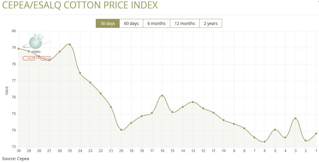 7月21日(周一),巴西CEPEA/ESALQ棉花價格指數(shù)報73.82美分/磅,較前一交易日上漲0.59%,較上月同期下跌3.01%。