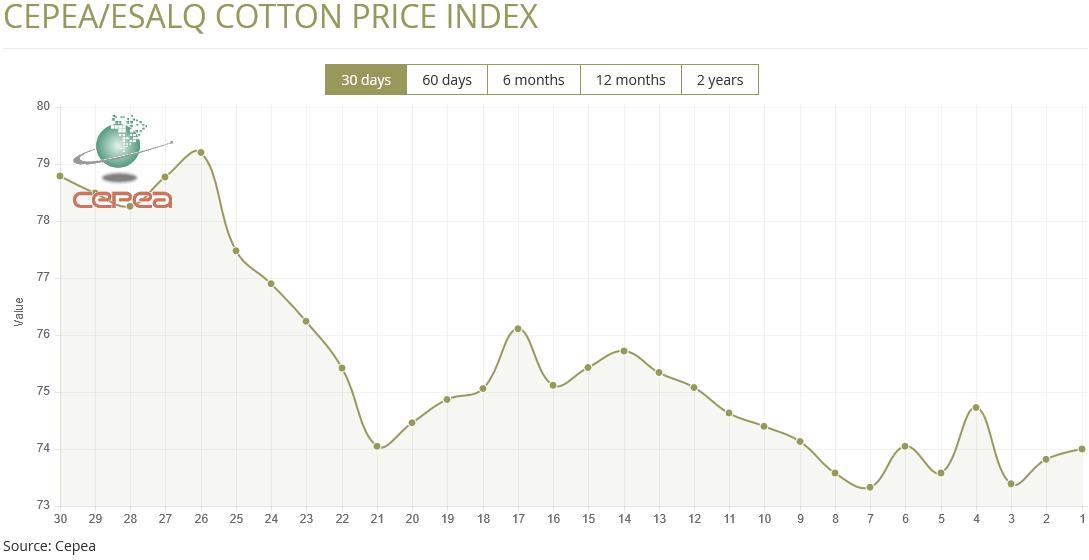 7月22日(周二),巴西CEPEA/ESALQ棉花價格指數(shù)報74美分/磅,較前一交易日上漲0.24%,較上月同期下跌2.77%。