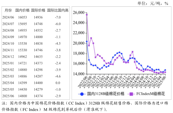 (一)國內(nèi)棉價(jià)環(huán)比小幅上漲。當(dāng)前棉花消化進(jìn)度較快,庫存總量繼續(xù)下降,供應(yīng)趨緊預(yù)期支撐棉價(jià)小幅上漲。據(jù)國家棉花市場監(jiān)測數(shù)據(jù)顯示,截至6月26日,全國棉花銷售率93.2%,較過去4年均值提高7.4個(gè)百分點(diǎn)。6月,國內(nèi)3128B級(jí)棉花月均價(jià)每噸14800元,環(huán)比漲2.6%,同比跌7.8%。鄭棉期貨主力合約(CF2509)月結(jié)算價(jià)每噸13685元,環(huán)比漲2.7%,同比跌6.9%。