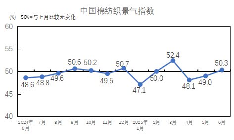 2025年6月,生產(chǎn)指數(shù)為50.1%,高于臨界點,較5月上升1.9個百分點。6月,中美經(jīng)貿(mào)磋商在倫敦舉行,雙方就落實共識達成原則框架,受此宏觀暖風(fēng)提振,紡織廠生產(chǎn)上升。從分項指數(shù)看,棉紡織廠設(shè)備開臺率指數(shù)為50.1%,高于臨界點,較5月上升1.6個百分點。紗產(chǎn)量指數(shù)為49.0%,較5月上升0.7個百分點;布產(chǎn)量指數(shù)為51.6%,較5月上升4.1個百分點;紗產(chǎn)量指數(shù)低于臨界點,布產(chǎn)量指數(shù)高于臨界點。
