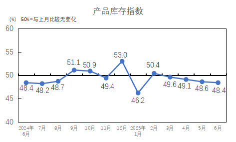 2025年6月,產(chǎn)品庫存指數(shù)為48.4%,低于臨界點,較5月下降0.2個百分點,產(chǎn)品庫存量上升。6月,中美經(jīng)貿(mào)磋商在倫敦舉行,雙方持續(xù)釋放宏觀利好消息,市場得到一定提振,但淡季行情下整體需求仍較疲弱,企業(yè)成品庫存上升。紗庫存量指數(shù)為48.3%,較5月下降0.5個百分點;布庫存量指數(shù)為48.5%,較5月上升0.2個百分點。紗庫存量指數(shù)和布庫存量指數(shù)均低于臨界點。