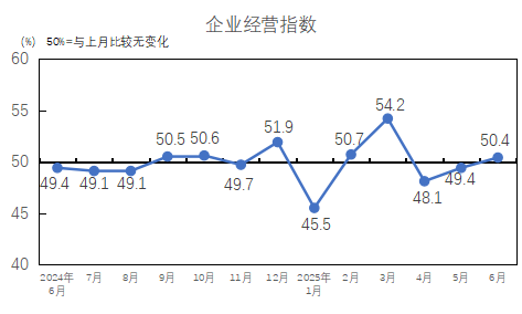 2025年6月,企業(yè)經(jīng)營指數(shù)為50.4%,高于臨界點,較5月上升1.0個百分點。6月,受中美經(jīng)貿(mào)磋商提振,宏觀市場情緒好轉(zhuǎn),企業(yè)產(chǎn)品銷售得到改善,營業(yè)收入和利潤總額較5月上升,企業(yè)經(jīng)營指數(shù)出現(xiàn)回升。從構(gòu)成企業(yè)經(jīng)營指數(shù)的分項指標(biāo)看,營業(yè)收入指數(shù)為50.3%,較5月上升2.4個百分點;利潤總額指數(shù)為50.5%,較5月下降0.4個百分點,營業(yè)收入指數(shù)和利潤總額指數(shù)均高于臨界點。
