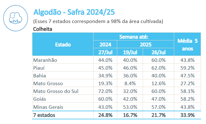 據(jù)巴西農(nóng)業(yè)部下屬的國家商品供應(yīng)公司CONAB,截至7月26日,巴西棉花收割率為21.7%,上周為16.7%,去年同期為24.8%,五年均值為33.9%。