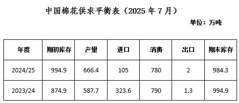 受未增發(fā)棉花進口配額、中美關稅談判不確定性、出口訂單較少等因素影響,今年以來棉花進口量大幅下降,6月我國棉花進口量不足3萬噸,創(chuàng)20年以來單月最低,本年度即將結束,預計總進口量將較預期進一步下降。中國棉花協(xié)會7月預測,2024/25年度全國棉花消費量780萬噸,同比下降1.3%;進口量105萬噸,較上期下調15萬噸,同比下降67.6%;產量666.4萬噸,同比增13.4%;期末庫存984.3萬噸,同比下降1.1%。
