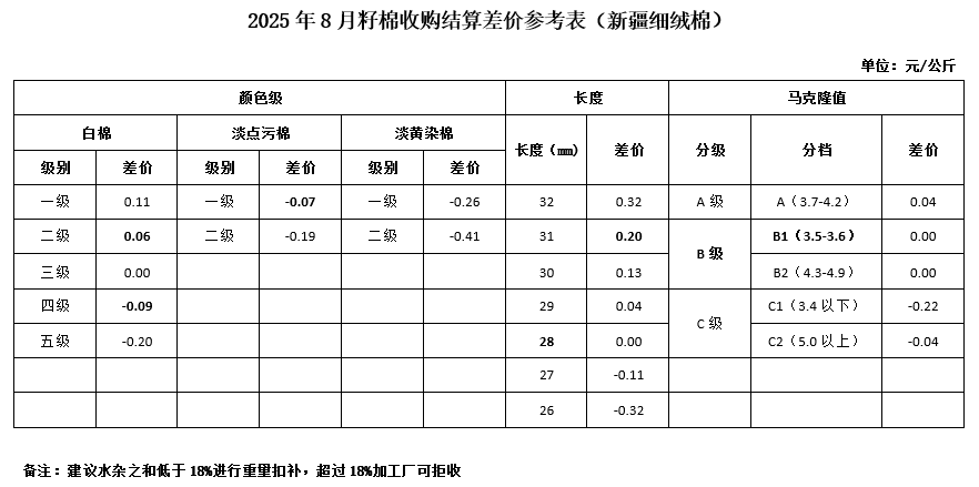 依據(jù)中國棉花協(xié)會發(fā)布的2025年8月《鋸齒加工細絨棉質(zhì)量差價表》和2024年9月-2025年2月新疆籽棉平均衣分率,折算得出籽棉收購差價,與上月相比,做如下調(diào)整: