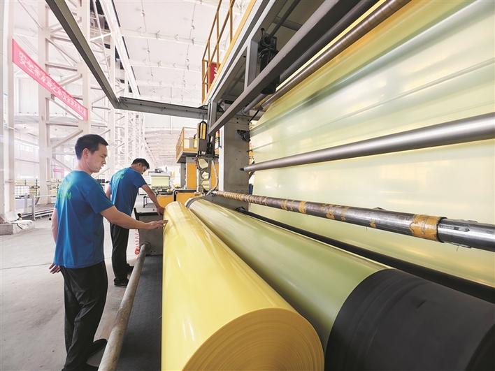 7月28日,在新疆綠力棉農(nóng)業(yè)科技有限公司生產(chǎn)車間,工人查看棉花打包膜生產(chǎn)情況。該公司是胡楊河經(jīng)濟(jì)技術(shù)開發(fā)區(qū)招商引資企業(yè),主要從事棉花打包膜研發(fā)和生產(chǎn),擁有先進(jìn)的吹膜、涂膠、拼接一體化生產(chǎn)線,今年上半年生產(chǎn)棉花打包膜1.5萬噸,實現(xiàn)產(chǎn)值3562萬元。