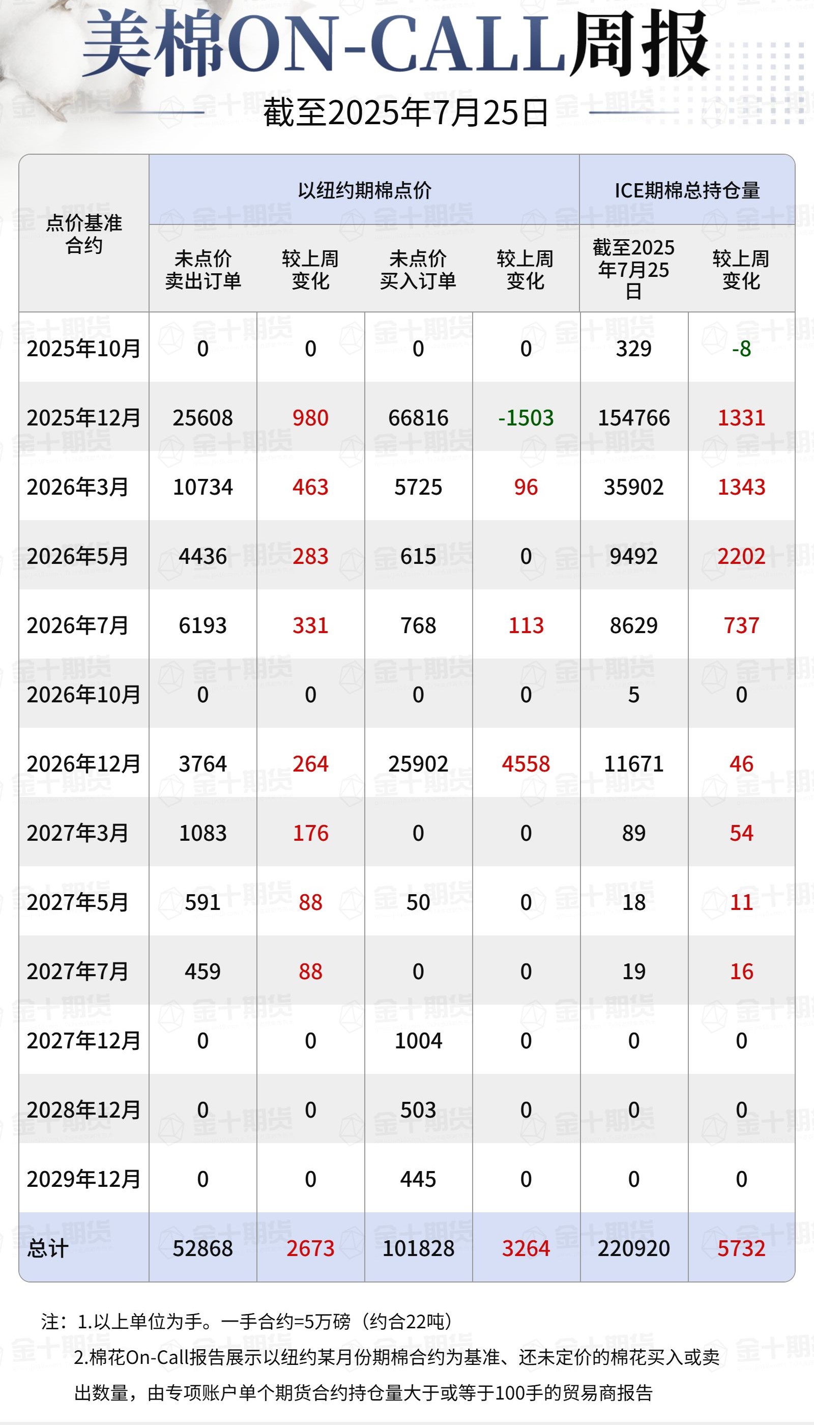 據(jù)美國商品期貨交易委員會(huì)(CFTC)最新數(shù)據(jù),截至7月25日,①美棉On-Call未點(diǎn)價(jià)賣出訂單52868手,環(huán)比增加2673手;未點(diǎn)價(jià)買入訂單101828手,環(huán)比增加3264手;②ICE期棉2510合約上賣方未點(diǎn)價(jià)合約為0手,環(huán)比增加0手;③ICE期棉2512合約上賣方未點(diǎn)價(jià)合約為25608手,環(huán)比增加980手;④ICE期棉2603合約上賣方未點(diǎn)價(jià)合約為10734手,環(huán)比增加463手;⑤ICE期棉2605合約上賣方未點(diǎn)價(jià)合約為4436手,環(huán)比增加283手;⑥ICE期棉2607合約上賣方未點(diǎn)價(jià)合約為6193手,環(huán)比增加331手;⑦ICE棉花期貨盤面2025/26年度(8月至次年7月)的On-Call合約未點(diǎn)價(jià)賣出訂單為46971手,環(huán)比增加2057手。