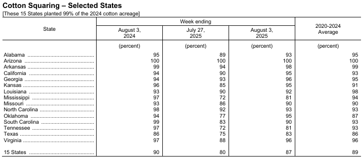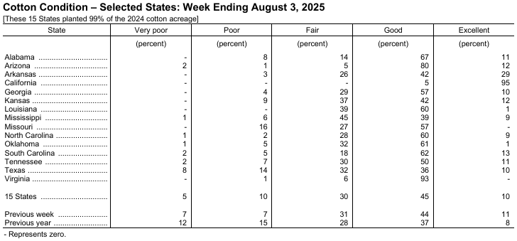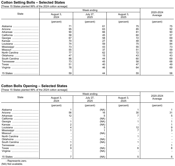 8月4日(周一),美國農(nóng)業(yè)部(USDA)在每周作物生長報告中公布稱,截至2025年8月3日當(dāng)周,美棉現(xiàn)蕾率為87%,前周為80%,上年同期為90%,五年均值為89%。美棉結(jié)鈴率為55%,前周為44%,上年同期為59%,五年均值為58%。美棉盛鈴率為5%,上年同期為7%,五年均值為6%。美棉優(yōu)良率為55%,前周為55%,上年同期為45%。