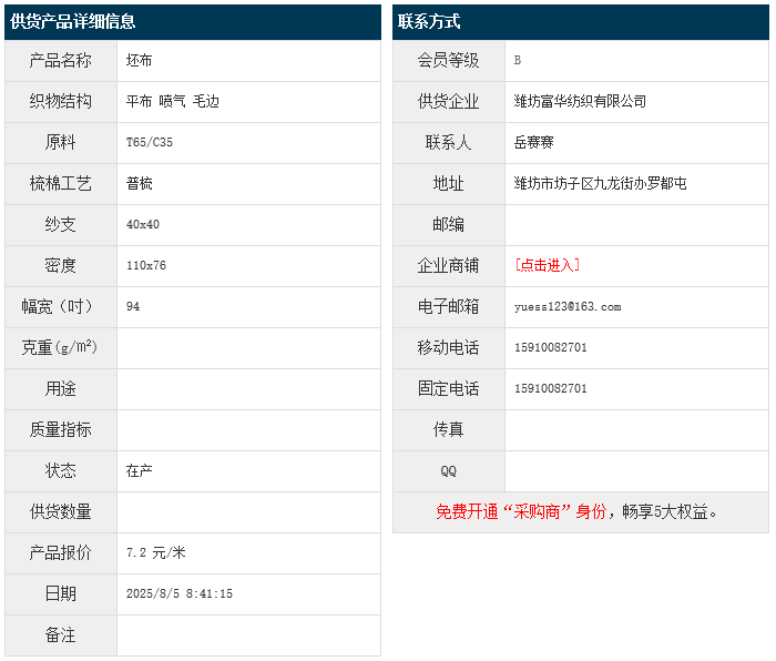 8月5日,濰坊富華紡織有限公司滌棉平布T65/C35 40x40 110x76 94" 噴氣 毛邊,報(bào)價(jià)為7.2元/米,實(shí)際成交價(jià)以協(xié)商為準(zhǔn)。[點(diǎn)擊查看詳情]
