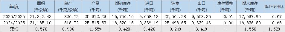2025/26年度全球棉花期末庫(kù)存預(yù)估為1709.79萬(wàn)噸,同比增加1.6%,2024/25年度期末庫(kù)存預(yù)估為1683.68萬(wàn)噸。