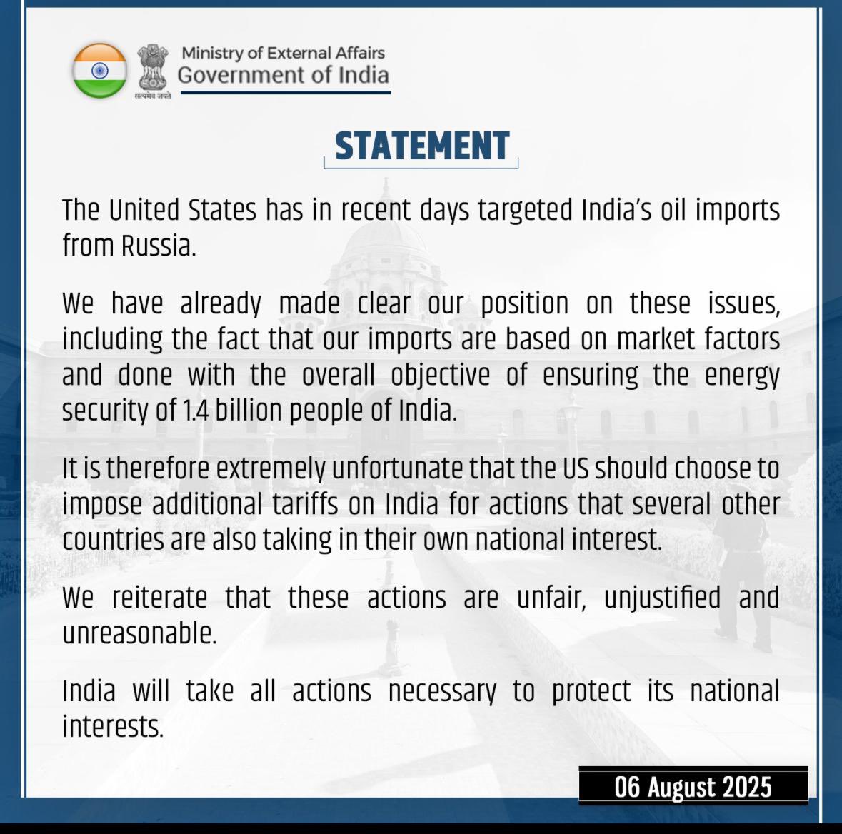 印度政府:美國加征額外關(guān)稅“不公平、不合理、不正當(dāng)”,將采取行動(dòng)保護(hù)國家利益。