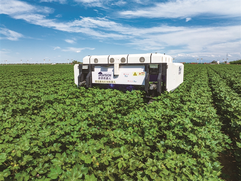 近日,昌吉市榆樹溝鎮(zhèn)榆樹溝村棉田,棉花激光打頂機(jī)器人正在作業(yè)。據(jù)了解,棉花激光打頂機(jī)器人由新疆極目機(jī)器人科技有限公司研發(fā),經(jīng)自治區(qū)農(nóng)業(yè)農(nóng)村機(jī)械化發(fā)展中心論證,該款機(jī)器人效率是人工的數(shù)十倍,作業(yè)合格率80%以上。不僅作業(yè)效率大幅提升,還能減少對(duì)棉桃和葉片的誤傷,為提升棉花質(zhì)量與產(chǎn)量提供保障。