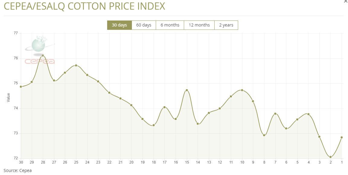 8月6日(周三),巴西CEPEA/ESALQ棉花價格指數(shù)報72.84美分/磅,較前一交易日上漲1.08%,較上月同期也下跌0.98%。