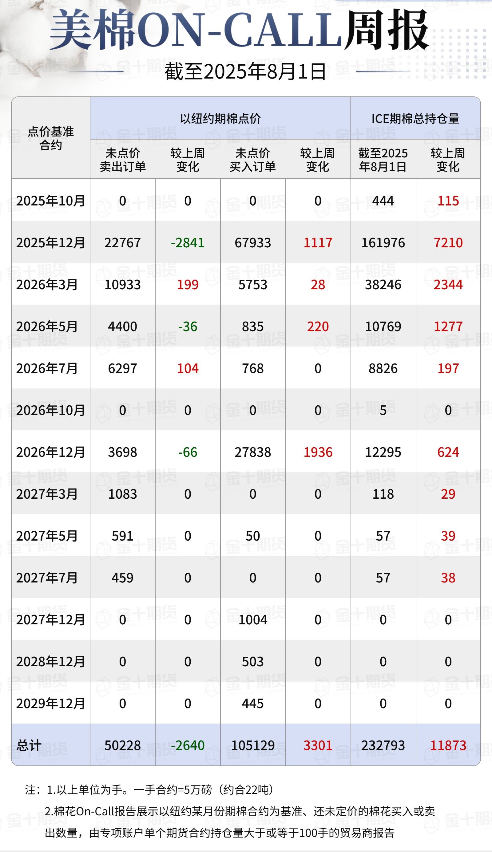 據(jù)美國商品期貨交易委員會(CFTC)最新數(shù)據(jù),截至8月1日,①美棉On-Call未點價賣出訂單50228手,環(huán)比減少2640手;未點價買入訂單105129手,環(huán)比增加3301手;②ICE期棉2510合約上賣方未點價合約為0手,環(huán)比增加0手;③ICE期棉2512合約上賣方未點價合約為22767手,環(huán)比減少2841手;④ICE期棉2603合約上賣方未點價合約為10933手,環(huán)比增加199手;⑤ICE期棉2605合約上賣方未點價合約為4400手,環(huán)比減少36手;⑥ICE期棉2607合約上賣方未點價合約為6297手,環(huán)比增加104手;⑦ICE棉花期貨盤面2025/26年度(8月至次年7月)的On-Call合約未點價賣出訂單為44397手,環(huán)比減少2574手。