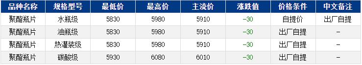 華東聚酯瓶片收于5910元/噸,漲跌值-30元/噸,成本走弱,聚酯瓶片工廠今日報盤多穩(wěn),部分下跌30元/噸,詢盤一般,成交中心窄幅下行。8-9月貨源報盤5850-5980元/噸或8月期貨合約2510-40至-10元/噸;9月期貨合約2509+0至50元/噸,2510+0至50元/噸;遞盤5820-5920元/噸,下游及貿(mào)易商逢低補貨。