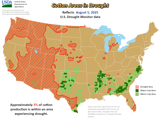 美國農業(yè)部(USDA)下屬的首席經濟學家辦公室(OCE)當地時間周四根據當日發(fā)布的美國旱情監(jiān)測圖整理的美國農業(yè)旱情文件顯示,截至8月5日當周,約3%美棉產區(qū)受到干旱影響,較前周下降2%。