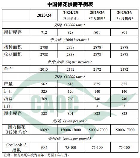 本月對(duì)中國(guó)棉花供需形勢(shì)預(yù)測(cè)與上月保持一致。全國(guó)大部分產(chǎn)區(qū)棉花處開(kāi)花盛期,新疆局部地區(qū)進(jìn)入裂鈴?fù)滦跗?,發(fā)育期較常年偏早。中國(guó)氣象局預(yù)測(cè),8月新疆和長(zhǎng)江流域棉區(qū)氣溫偏高、降水偏少,棉花遭受高溫?zé)岷︼L(fēng)險(xiǎn)較高。當(dāng)前棉花商業(yè)庫(kù)存持續(xù)下降,同時(shí)棉紡織旺季即將到來(lái),棉價(jià)存在底部支撐。