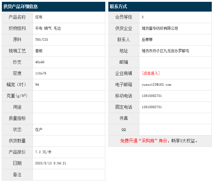 8月13日,濰坊富華紡織有限公司滌棉平布T65/C35 40x40 110x76 94" 噴氣 毛邊,報(bào)價(jià)為7.2元/米,實(shí)際成交價(jià)以協(xié)商為準(zhǔn)。[點(diǎn)擊查看詳情]