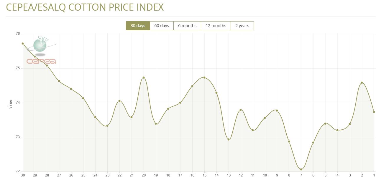 8月13日(周三),巴西CEPEA/ESALQ棉花價(jià)格指數(shù)報(bào)73.73美分/磅,較前一交易日下跌1.14%,較上月同期上漲0.23%。