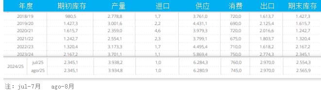 以下為巴西棉花供需平衡表(單位:千噸)