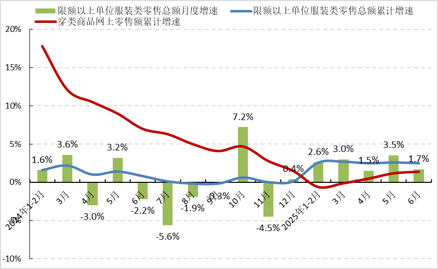 上半年,隨著國家提振消費(fèi)專項(xiàng)行動(dòng)扎實(shí)推進(jìn),在假期消費(fèi)、各類促銷活動(dòng)增多等因素的作用下,我國居民衣著消費(fèi)需求持續(xù)釋放,市場供給不斷優(yōu)化,服裝內(nèi)銷實(shí)現(xiàn)溫和增長。據(jù)國家統(tǒng)計(jì)局?jǐn)?shù)據(jù),1-6月我國限額以上單位服裝商品零售額累計(jì)5341.3億元,同比增長2.5%,增速比2024年同期加快1.7個(gè)百分點(diǎn)。直播電商等業(yè)態(tài)模式持續(xù)激活消費(fèi),疊加“618”優(yōu)惠活動(dòng)提前,線上銷售增速穩(wěn)步回正。1-6月穿類商品網(wǎng)上零售額同比增長1.4%,比1-3月提升1.5個(gè)百分點(diǎn)。