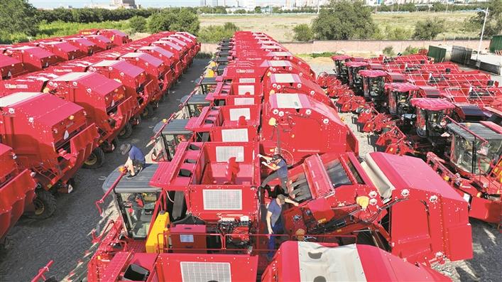 8月15日,在位于天北經(jīng)濟技術(shù)開發(fā)區(qū)的胡楊河天鵝智慧農(nóng)業(yè)科技有限公司,工人們對采棉機進行檢修保養(yǎng)。今年,該公司引進激光下料機、自動化淬火線、自動化激光切割機、自動包裝流水線等國內(nèi)一流的智能化、自動化生產(chǎn)設(shè)備,顯著提高鋸片加工質(zhì)量和效率,降低綜合運營成本,生產(chǎn)的軋花鋸片占據(jù)全疆市場份額的40%。