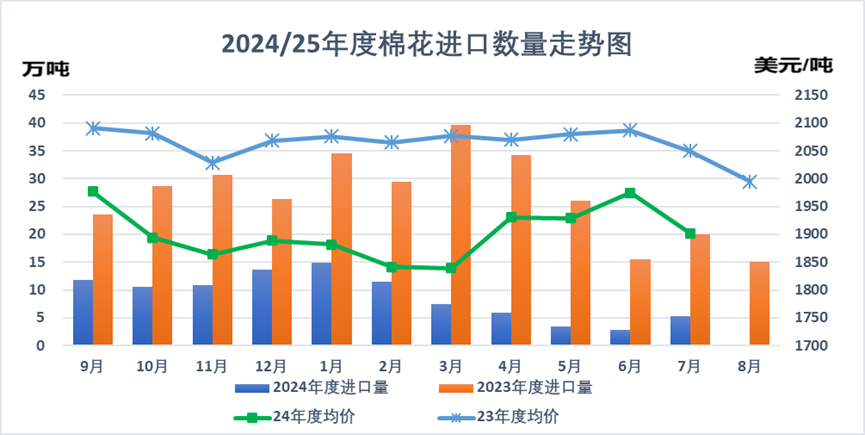 2025年7月,中美第三輪經(jīng)貿(mào)會談達(dá)成共識,關(guān)稅措施展期90天,美國同其他國家的關(guān)稅談判方向也逐漸明朗,外部貿(mào)易環(huán)境的確定性因素拉動棉花進(jìn)口暫時回暖,環(huán)比增長近1倍。隨著紡織傳統(tǒng)旺季的臨近,出口訂單有望回暖,8月棉花進(jìn)口量仍可能保持較高水平。