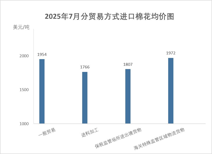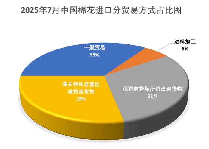 7月我國棉花進(jìn)口各貿(mào)易方式中,一般貿(mào)易占比最高,為35%,環(huán)比增長2個百分點;保稅監(jiān)管場所進(jìn)出境貨物排第二位,占比31%,環(huán)比增長12個百分點;海關(guān)特殊監(jiān)管區(qū)域物流貨物占比28%,環(huán)比下降6個百分點;進(jìn)料加工貿(mào)易占比6%,環(huán)比下降8個百分點。