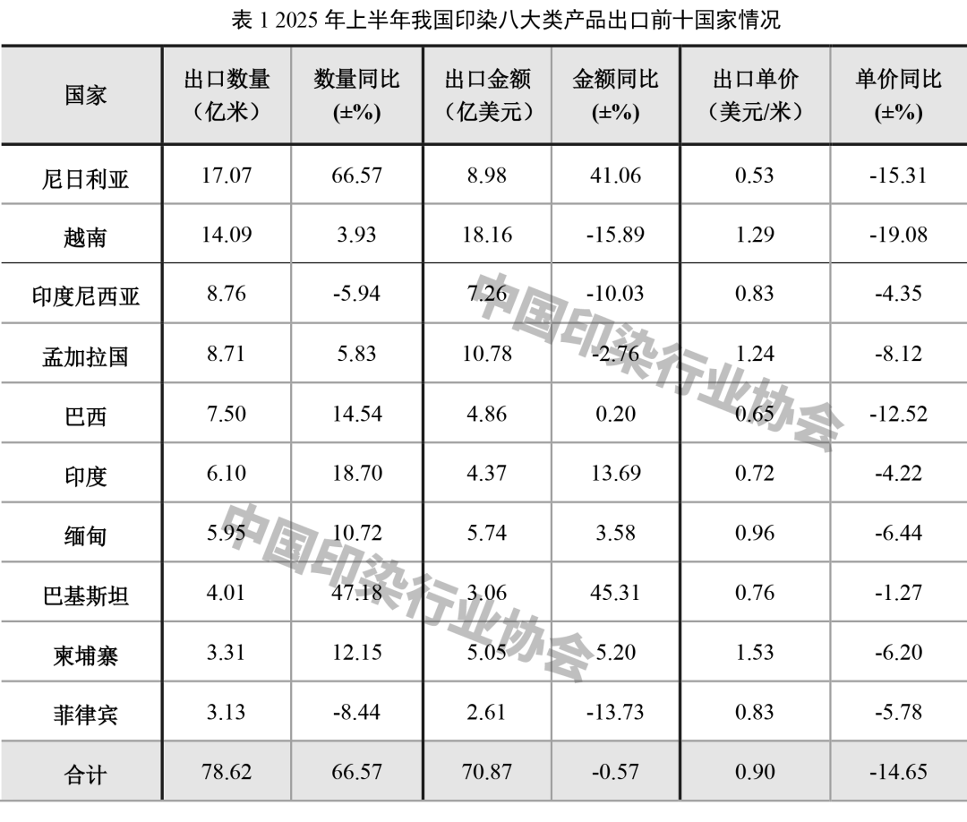 對(duì)東盟出口放緩,我國印染行業(yè)加快拓展其他出口市場(chǎng)。上半年,我國印染八大類產(chǎn)品對(duì)尼日利亞、巴西、印度、巴基斯坦等國家出口數(shù)量實(shí)現(xiàn)較快增長(zhǎng),其中對(duì)尼日利亞和巴基斯坦出口數(shù)量同比增幅分別達(dá)到66.57%和47.18%,對(duì)印度出口數(shù)量增速接近20%。從出口平均單價(jià)看,對(duì)前十國家出口單價(jià)平均下降14.65%,其中對(duì)尼日利亞、越南、巴西出口單價(jià)降幅均高于行業(yè)整體水平。
