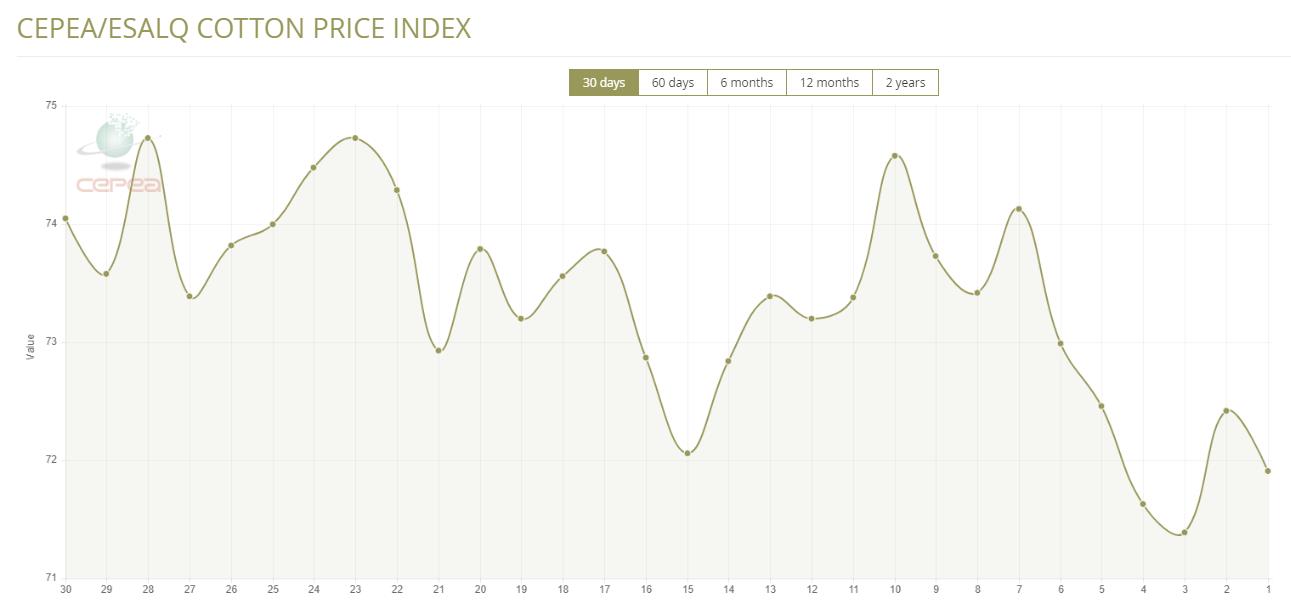 8月25日(周一),巴西CEPEA/ESALQ棉花價(jià)格指數(shù)報(bào)71.91美分/磅,較前一交易日下跌0.70%,較上月同期下跌2.24%。