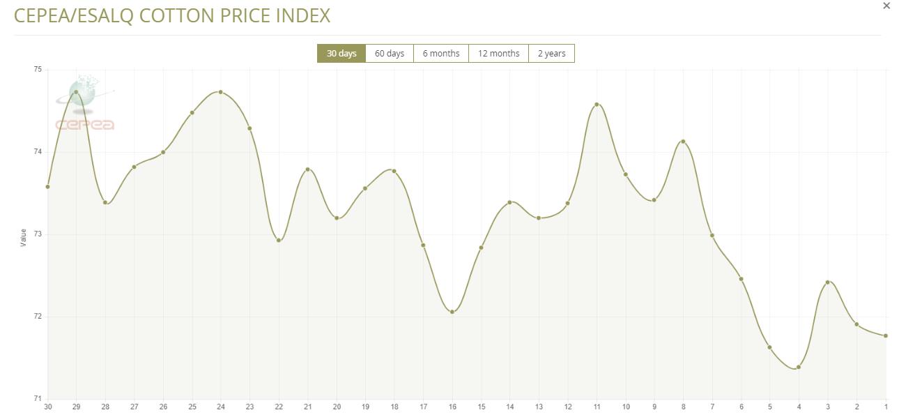 8月26日(周二),巴西CEPEA/ESALQ棉花價格指數(shù)報71.77美分/磅,較前一交易日下跌0.19%,較上月同期下跌2.43%。